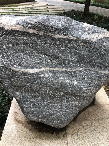展样是花岗岩经韧性剪切变形的构造岩。主要由钾长石、斜长石、石英和黑云母组成,大致定向排列,钾长石斑晶多形成眼球状等不对称旋转碎斑系。基质中细粒化的长石、石英和云母等的集合体拉长定向,形成条纹、条带状构造,构成糜棱面理和线理。岩石遭受了深层次强烈的韧性剪切变形改造。