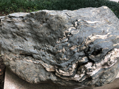 展样主要由绿泥石、方解石和石英组成,具鳞片状-粒状变晶结构,片状构造,可见沿片理产出的方解石脉体。由海相沉积的薄互层状砂泥质沉积岩经多期次区域变形变质而成。本样品可识别出三期构造作用:第一期呈残存状,第二期保存在岩石下部,显示为灰白色方解石成分层呈紧闭的或片内无根平卧褶皱。以方解石脉状体组成的一系列褶皱是一个大型褶皱(复式向形)的转折端内的次级褶皱,为第三期褶皱。