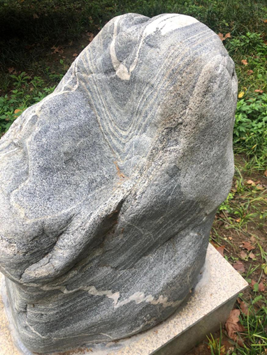 展样主要由斜长石、钾长石、石英、黑云母和普通角闪石组成,具粒状-片状变晶结构,片麻状和条带状构造,呈现为浅色和暗色条带相间平行排列,浅色条带长英质矿物含量较高,暗色条带黑云母和角闪石等铁镁质矿物含量较高。可见不同样式褶皱变形。标本底部可见长英质脉体的褶皱变形,侧面的花岗闪长岩脉体切割片麻理,未见明显变形。